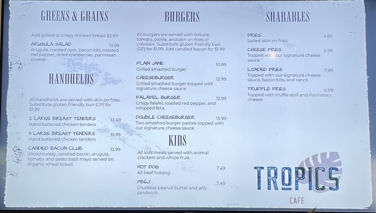 Tropics Café caters to a variety of palates with a menu that invites exploration. Start with the Greens & Grains selection, where the Arugula Salad stands out with its peppery greens and vibrant toppings, making it a fresh choice for health-conscious diners. If you’re dining with little ones, the Hot Dog and the classic Pb&J are surefire hits that keep the kiddos smiling.